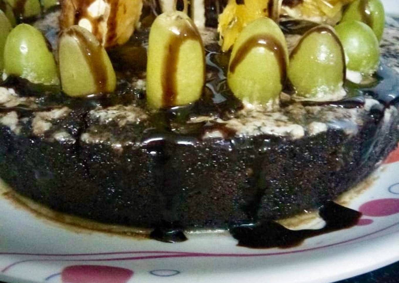 - Phir cake ko achhe se thanda hone de and ek plate mein transfer karein cake ko, whipped cream se decoration karein and upar se fruits lagaye and decoration karein, fruits se decorate karne ke baad chocolate syrup spread karein whole cake mein