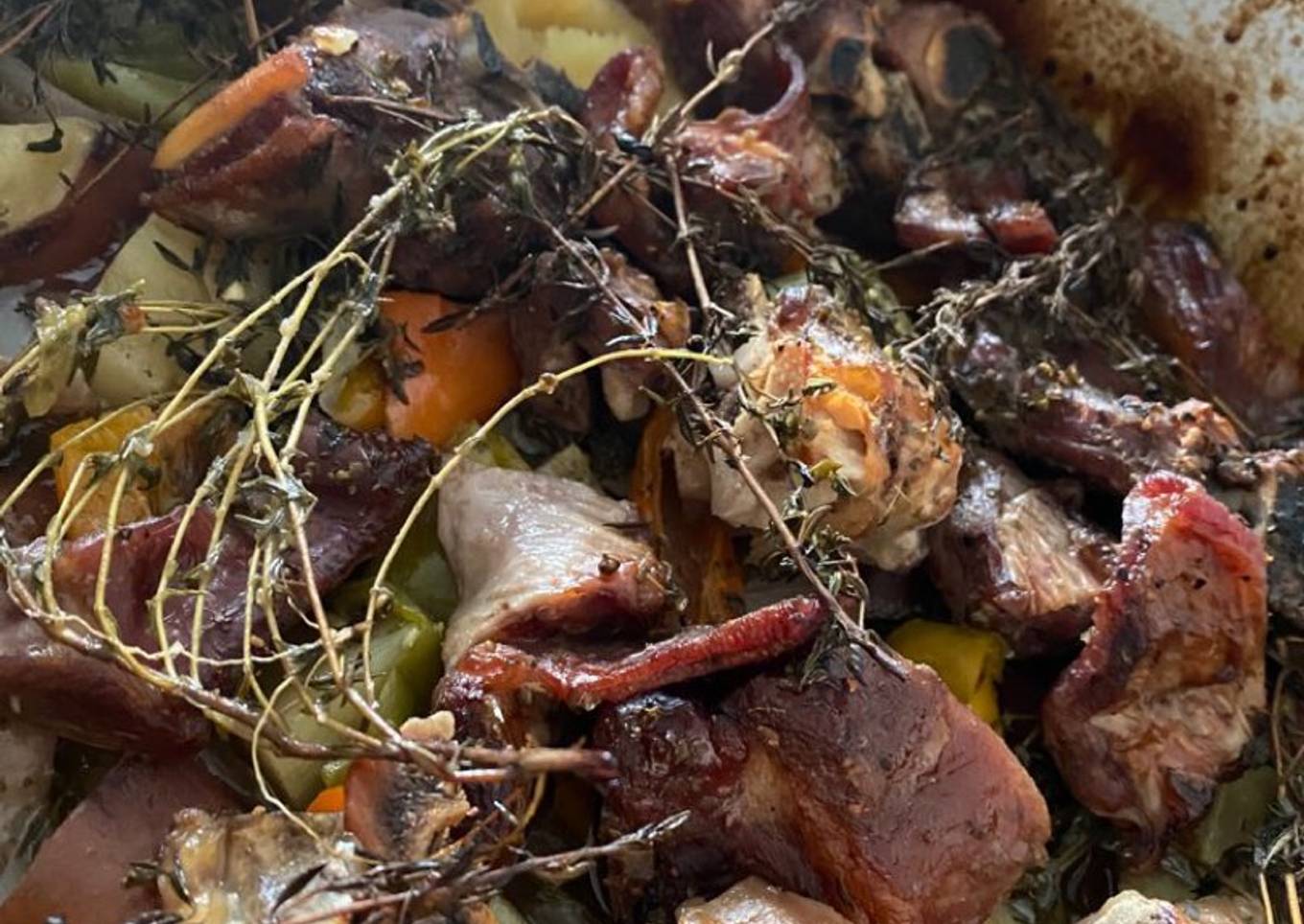 - Then put peppers and lamb on top. Poor rest of herbs, wine and water in