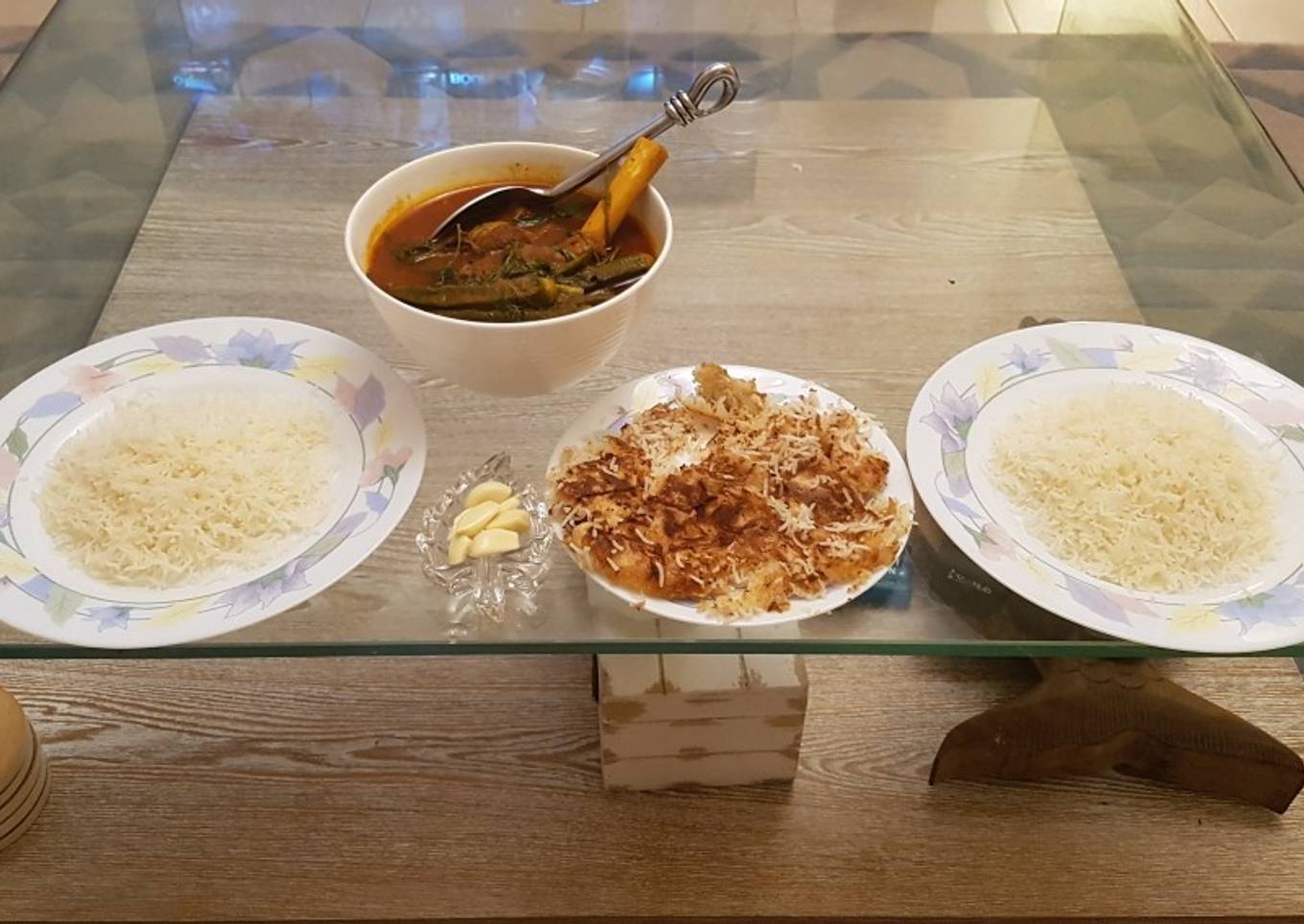- Rice with tardic: Melt a stick of butter in water in the pot used for the rice, switch off the flame and pour out had to save for later. Line the bottom of the pot with wrap bread. Add a bit of the butter water mixture back. Then add the rice back in to the pot. Pour the rest of the butter mixture and a few dashes of olive oil and mix it in a bit. Fold a piece of cloth over the lid and continue cooking the rice under low heat. Approx. 30 min. Bonus note: slightly higher heat at the start.