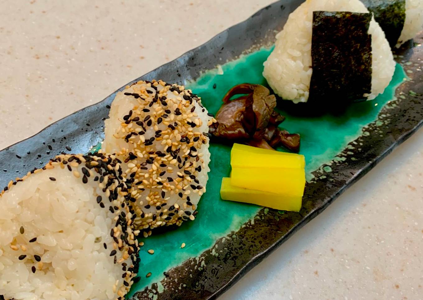 - On a plate, sprinkle mixture of black and white toasted sesame seeds. Take katsuobushi filling rice ball and then run through the 3 surfaces that are not triangle shape. Use nori sheet to cover two triangular side of salmon rice ball. Serve with Japanese pickled vegetables on the side.